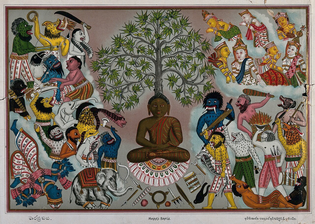 Buddha in meditation, surrounded by demons of Mara.