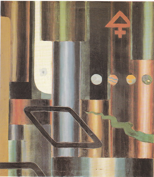 The following painting, according to the book Alchemical Mercury: A Theory of Ambivalence by Karen Pinkus, is now in the Kunsthaus of Zurich. On one of the many geometric blocks, Evola has written “Hg” (the symbol for Mercury) in red ink. According to Pinkus, “this is a very interesting gesture, especially as the inscription seems entirely disjoined from the composition itself, as if it had been an afterthought, and a reflection of the troubled relationship between modern chemistry as abstraction and alchemical materiality.”